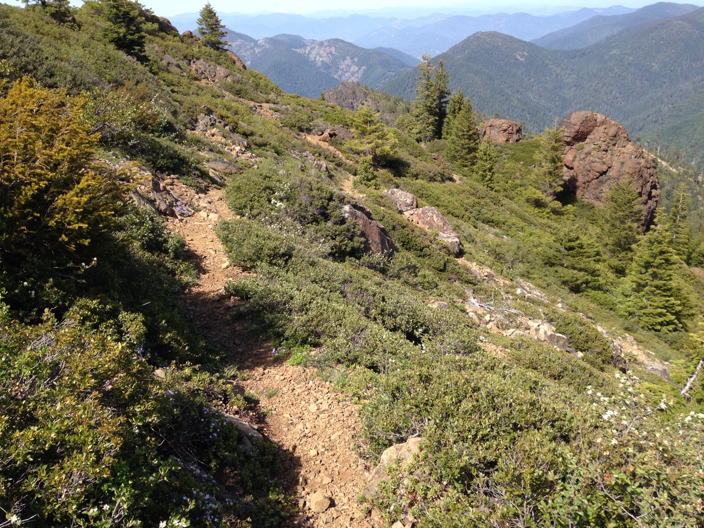 At the top, there is a survey marker embedded in the rock, noting the peak and its elevation. It was definitely an accomplishment to sit on top of the rock and enjoy the majestic view of the Southern Oregon mountains (including Bolan Peak which we’d hike the following week).